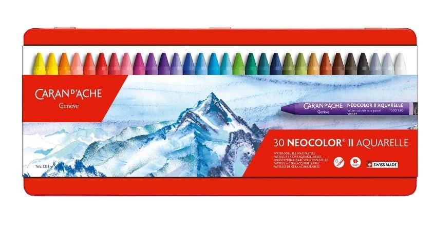 Neocolor II Aquarelle are water-soluble wax pastels for dry or wet drawings on any type of material (paper, cardboard, glass, wood, leather, fabric, stone). Suitable for techniques such as watercolour, coating, glazing, scraping, soaking, ink-wash, monotype, solid painting, rainbow technique, application on light pane and more.