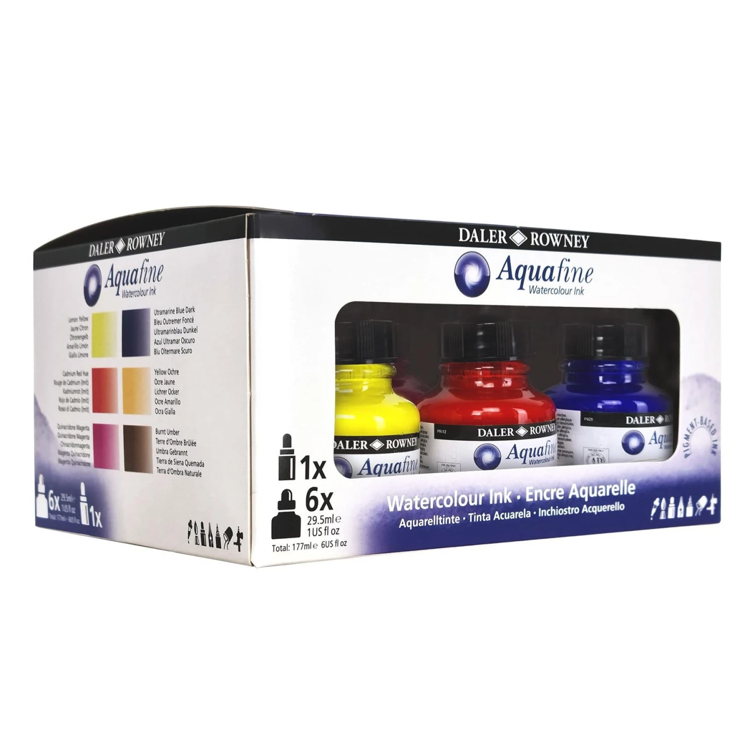 Set of 6 x 29.5ml Aquafine inks plus 1 FW Refillable Marker for precise application.