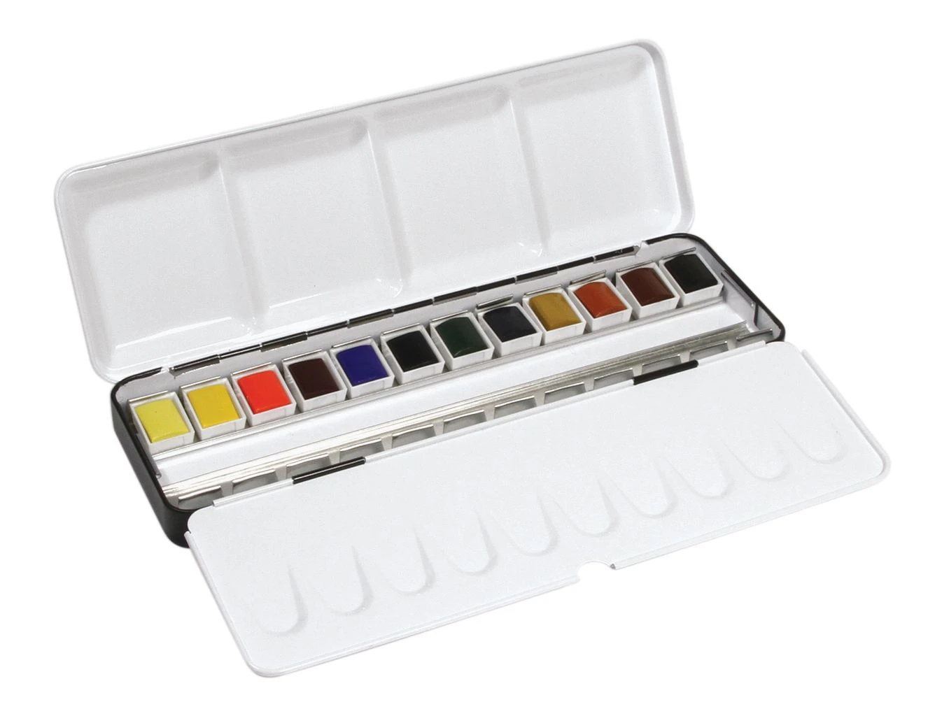 A metal box containing 12 assorted half pan colours from the Daler-Rowney Aquafine range.