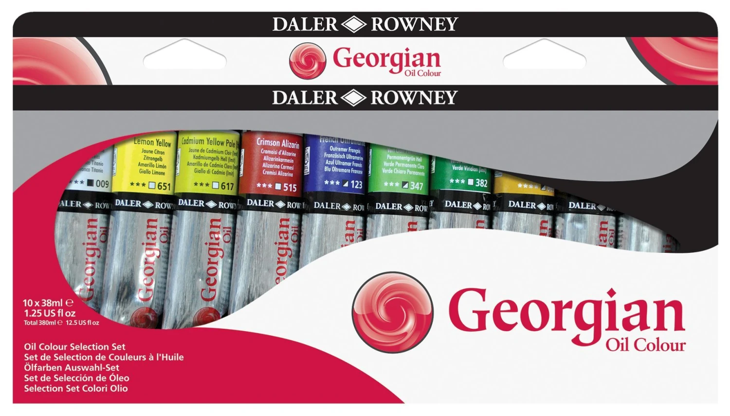 This introductory set includes ten 38ml tubes in the following colours: Titanium White, Lemon Yellow, Cad red, Crimson Alizarin, French Ultramarine, Viridian, Yellow Ochre, Burnt Sienna, Raw Umber and Ivory Black