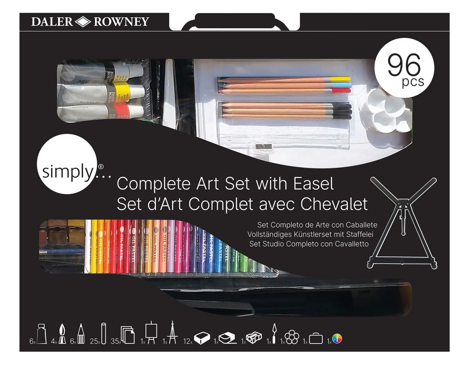 Contents: 6 x 12ml Acrylic Tubes, 25 Oil Pastels, 1 Gum Eraser, 1 Mixed Media Art Board, 3 Acrylic Brushes, 35 Drawing Sheets, 1 Pencil Sharpener, 1 Table Easel, 12 x Watercolour Half Pans, 3 Drawing Pencils, 1 Palette Knife, 1 Carrying Case, 1 Travel Watercolour Brush, 3 Colouring Pencils, 1 Mixing Palette & 1 Colour Mixing Guide.