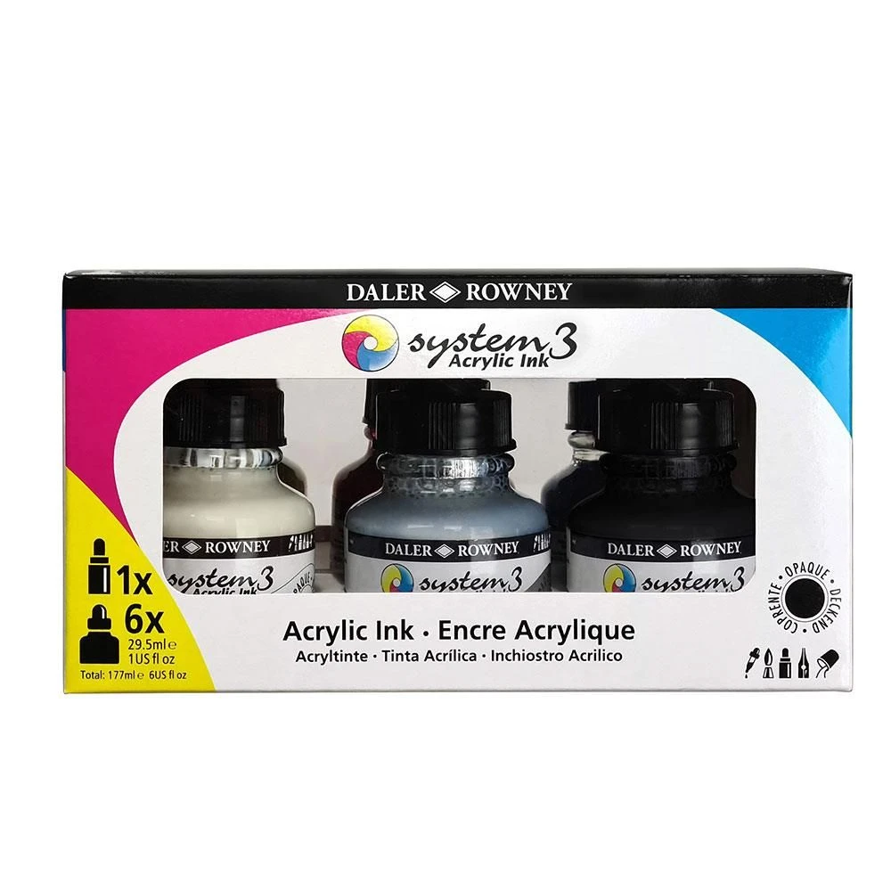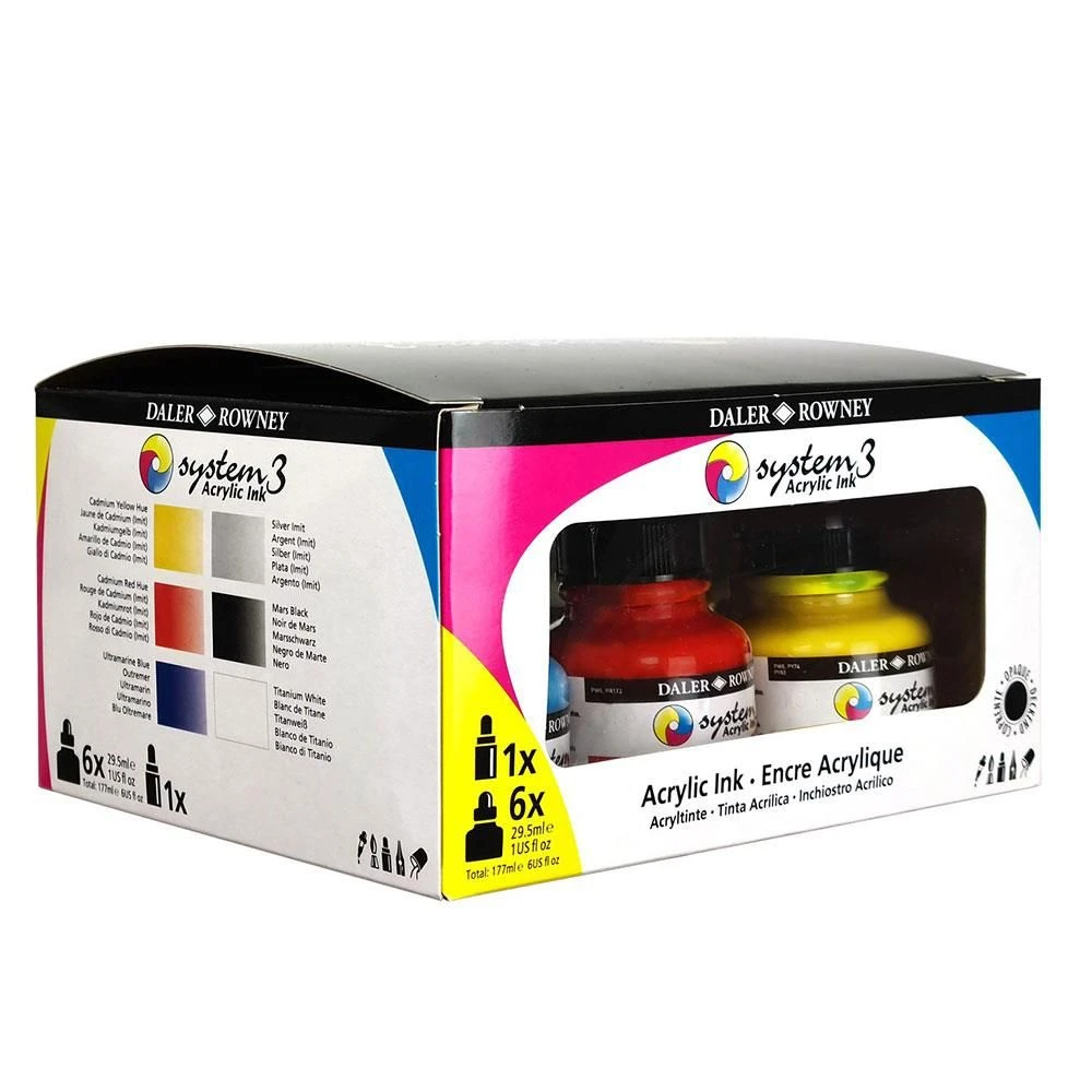 6 x 29.5ml System 3 Ink (Cadmium Yellow Hue, Cadmium Red Hue, Ultramarine Blue, Silver Imit, Mars Black and Titanium White).