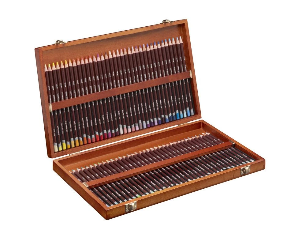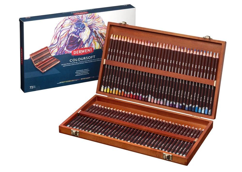 A deluxe wooden box containing 72 professional quality Coloursoft pencils from Derwent.