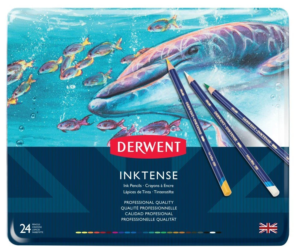 Derwent Inktense are a water-soluble, permanent and bright colouring pencil. You can use them dry but mix them with water and the colour turns into vibrant ink. Once dry, the colour is fixed, and you can work over the top of it, allowing layer upon layer of transparent colour.