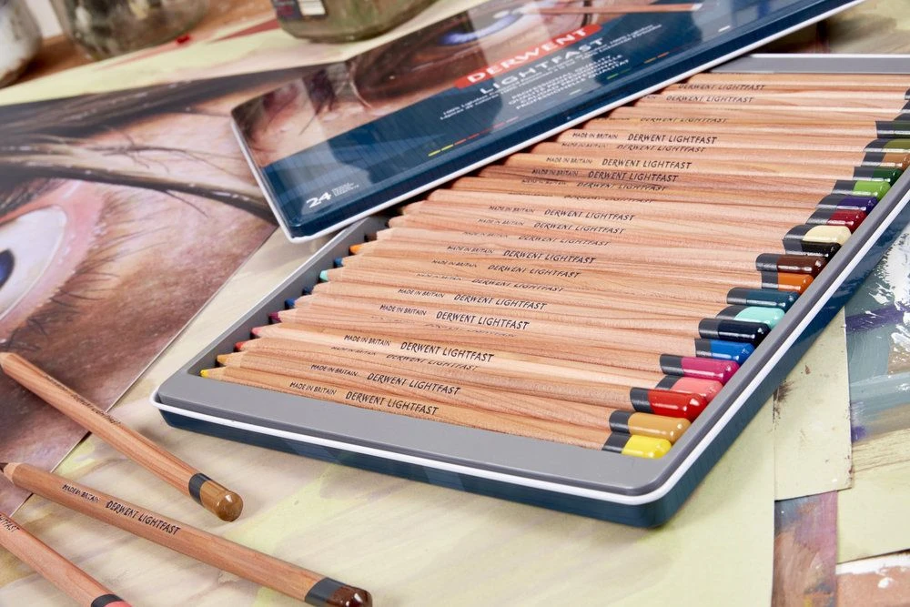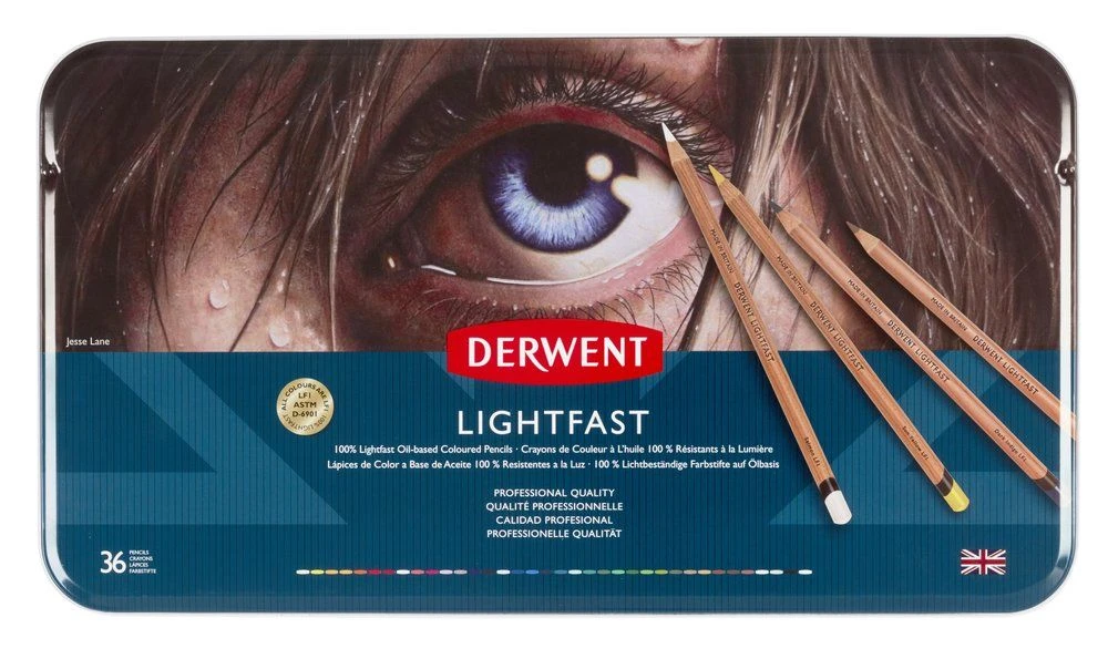 A tin set of 36 professional quality Derwent Lightfast colour pencils.