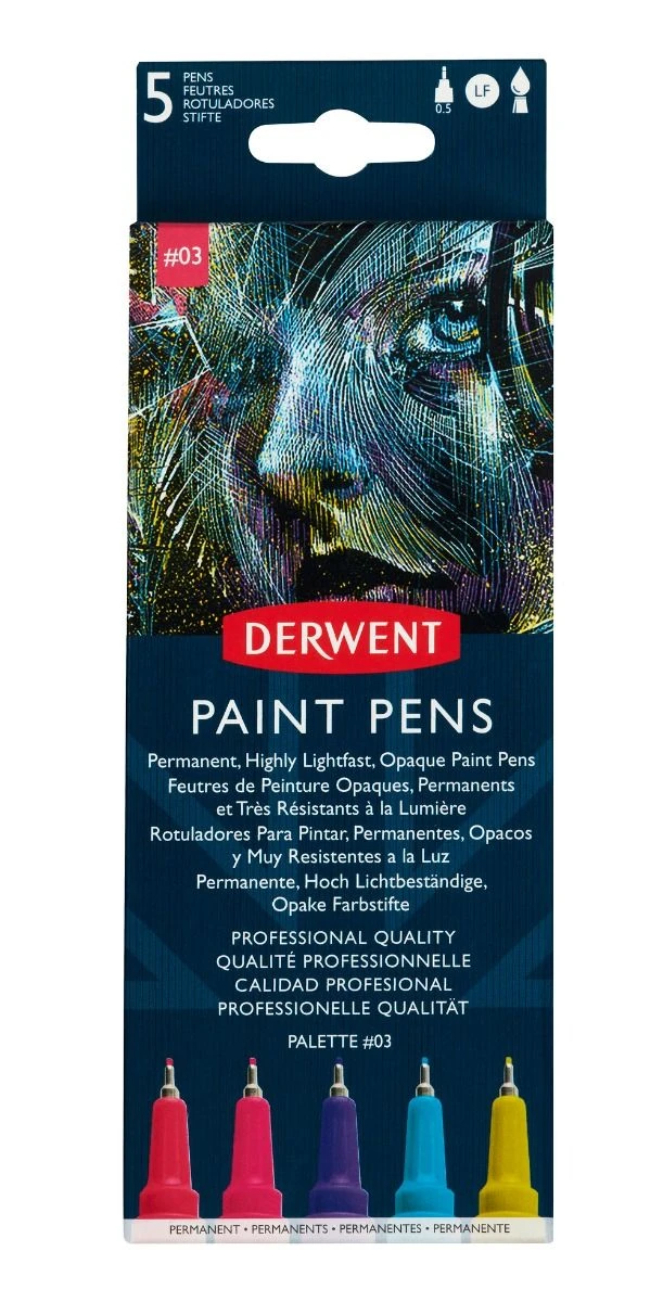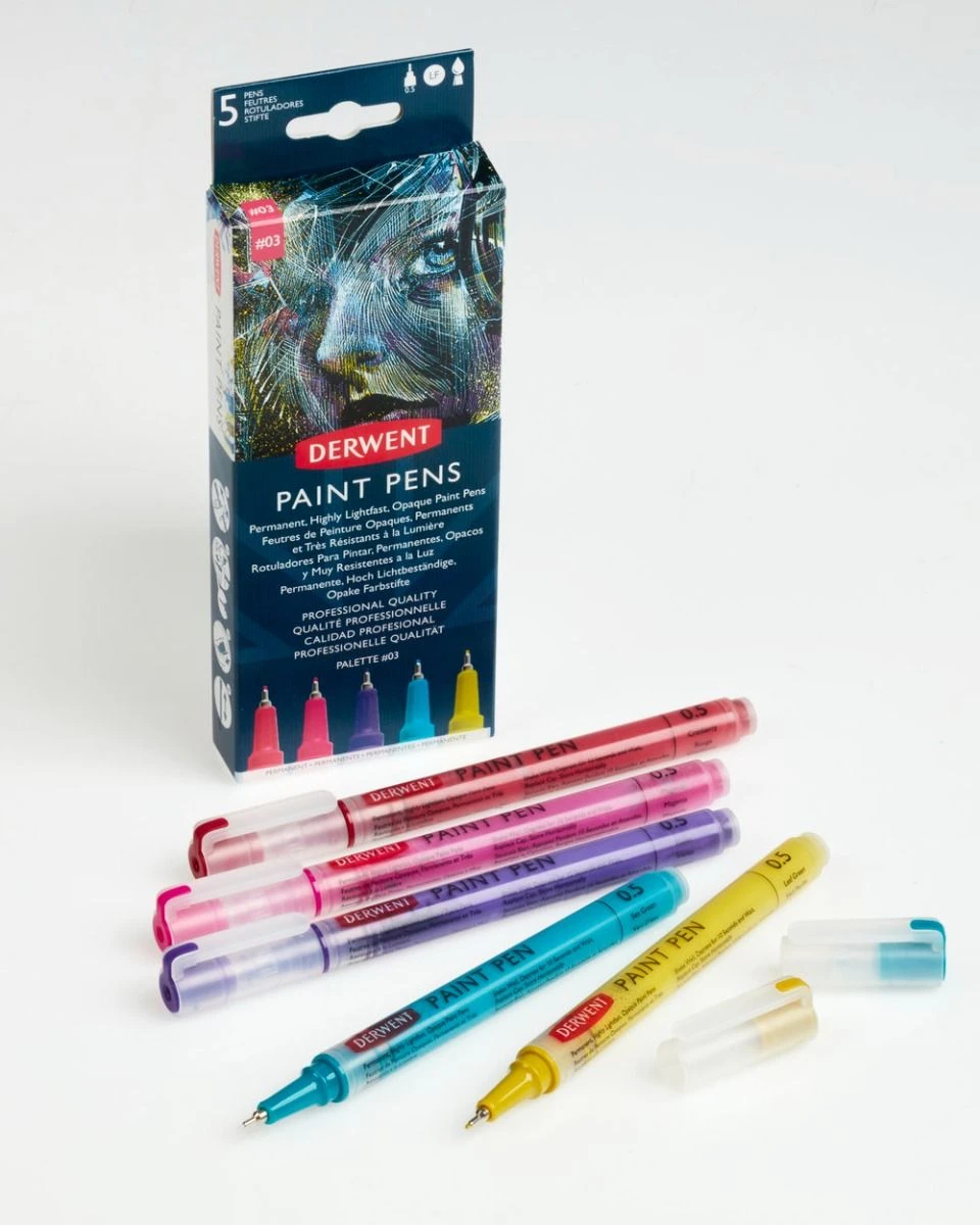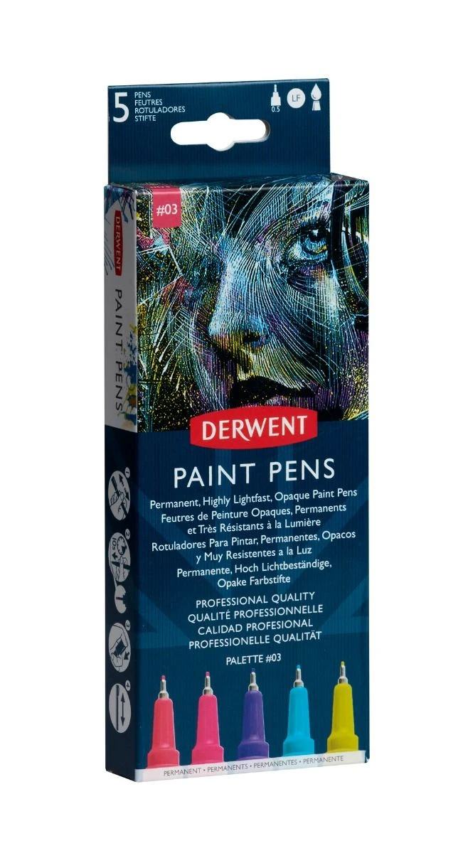 Derwent Paint Pens are a creative drawing and painting tool. The high-quality 0.5 Japanese nibs are very durable and allow for a variety of unique paint effects from fine lines to large layers and exciting splatters.