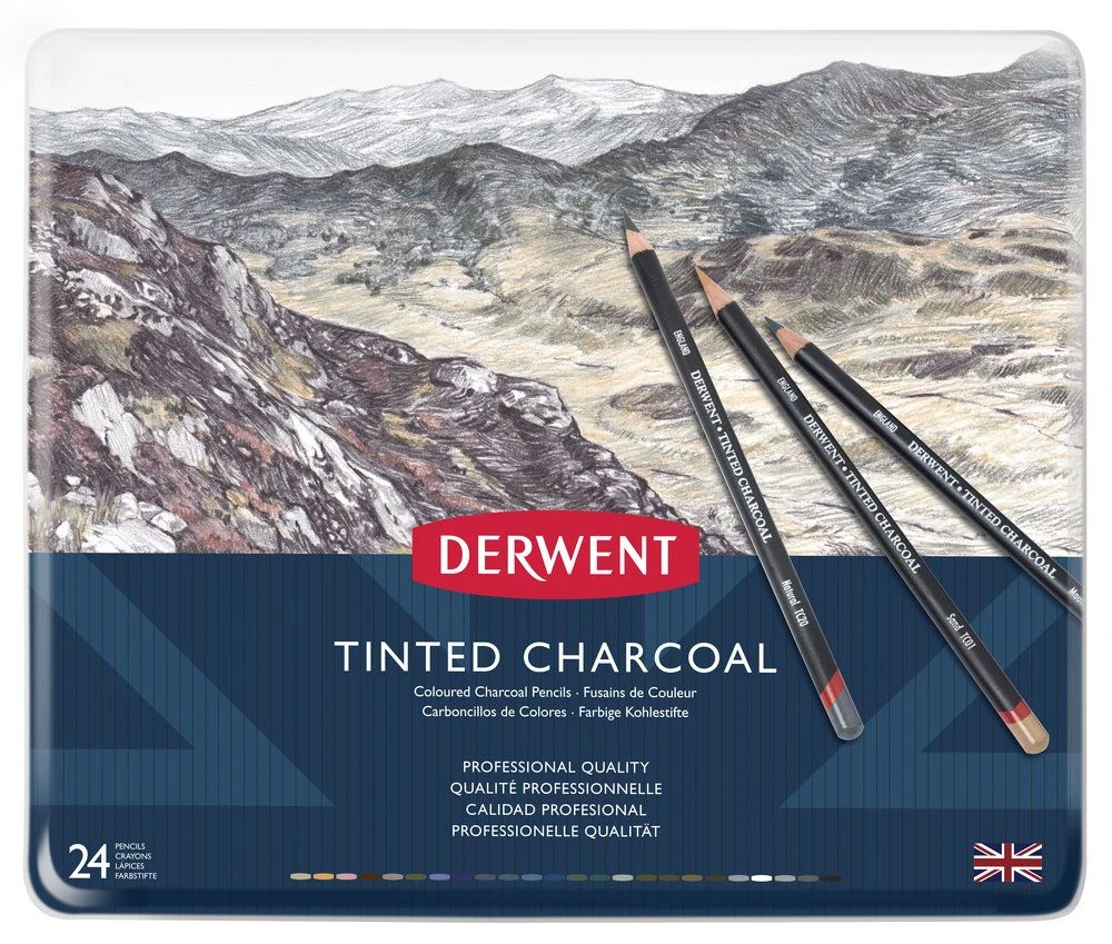 This tin contains the full range of 24 colours available in the Tinted Charcoal range of pencils.