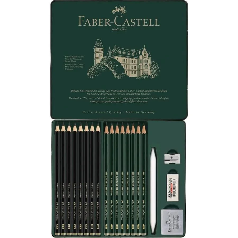 Content: 8 Pitt Graphite Matt pencils in HB, 2B, 4B, 6B, 8B, 10B, 12B, 14B, 8 Castell 9000 pencils in B, 2B, 3B, 4B, 5B, 6B, 7B, 8B, 1 blending stump, 1 eraser, 1 kneadable eraser, 1 metal single hole sharpener.