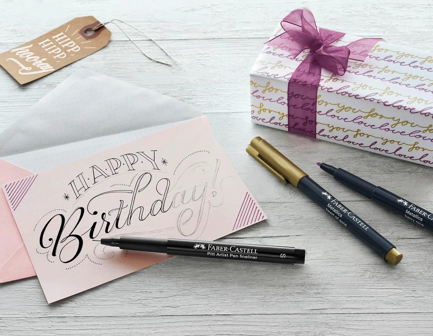 In addition to a pencil for prelimary sketches, it contains Pitt Aritst Pen fineliners for outlines, fine details and decorations, Pitt Artist Pens with a brush tip for lettering, swings and fill-ins as well as Metallic markers for shiny effects.Â