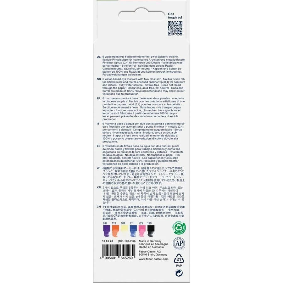 A pack of 6 water-based dye markers with two nibs: soft, flexible brush nib for artistic work and metal-encased fineliner tip (0.4mm) for contours and details.