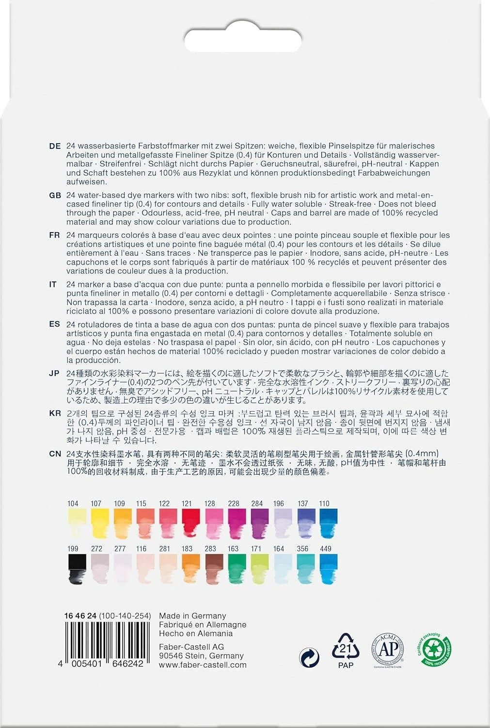 A pack of 24 water-based dye markers with two nibs: soft, flexible brush nib for artistic work and metal-encased fineliner tip (0.4mm) for contours and details.