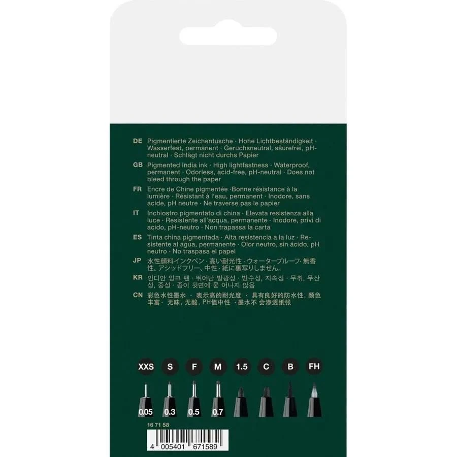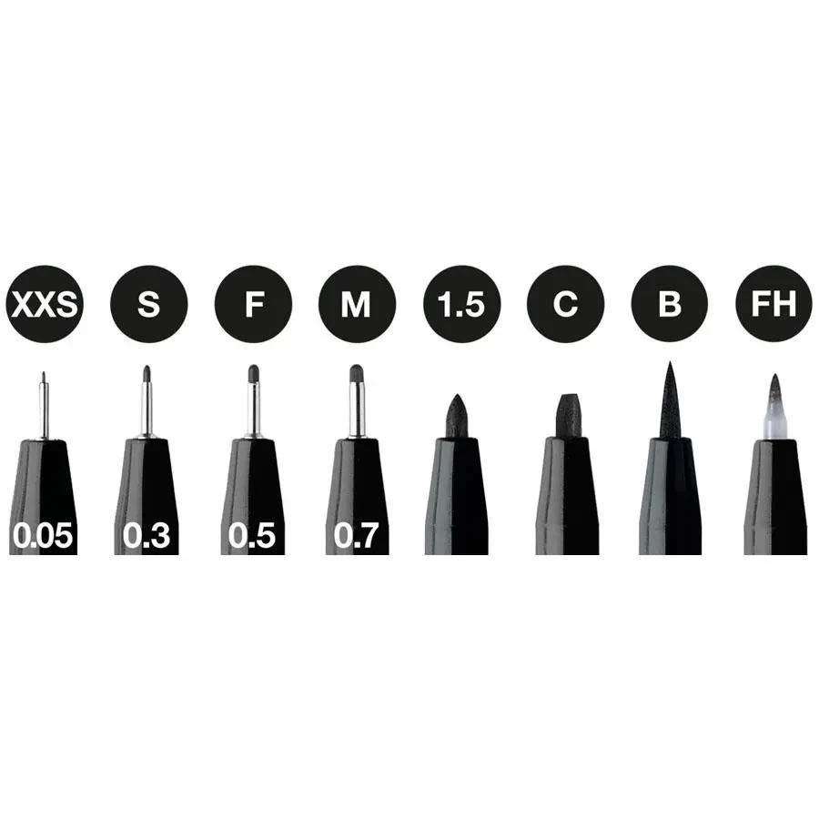 Contents: XXS (Fine 0.05mm), S (Fine 0.3mm), F (Fine 0.5mm), M (Fine 0.7mm), B (Brush Tip), C (Calligraphy Nib 2.5mm), 1.5 (Bullet 1.5mm), FH (Fude Hard Brush Tip).