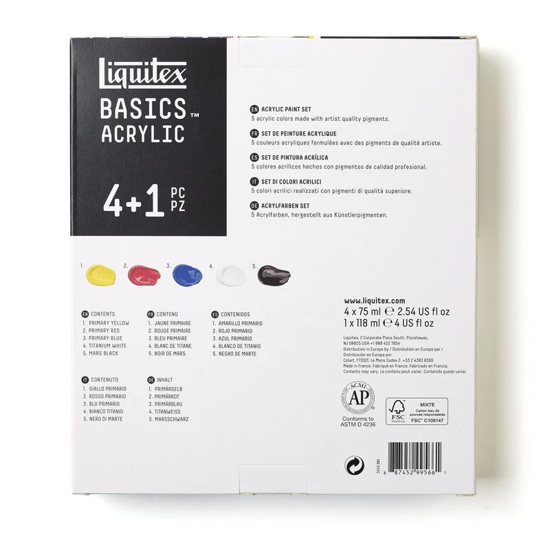 A set of 5 acrylic essential colours – 3 primaries, black and white.