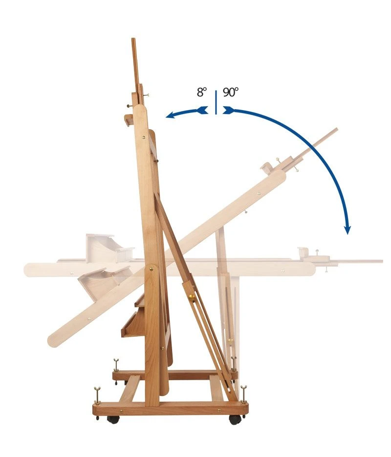 The MABEF M-18 Convertible Studio easel is crafted from oiled beech wood and can hold both vertically and horizontally positioned canvases. Lock this easel in any position between vertical and horizontal, allowing for angle selection based on personal style.