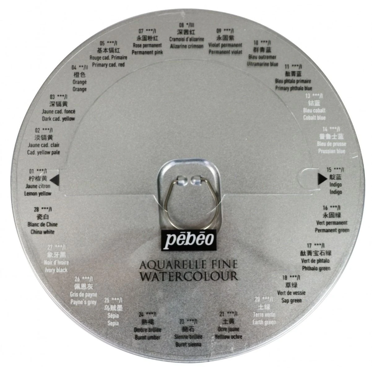 An assortment of 24 half pans from the Pebeo Aquarelle Fine range of watercolours. This is a vibrant, transparent and high quality student colour presented in a very useful metal travel tin. The tin includes a mixing palette; the circular shape ideal for mixing in a colour wheel.