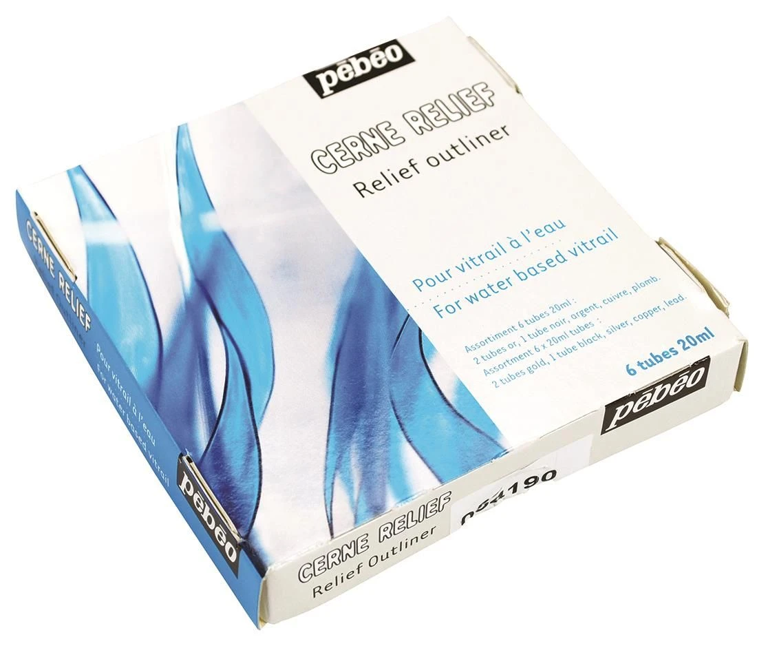 6 assorted relief outliners for use with waterbased Vitrail glass paint: glossy and transparent colours that can be mixed together and are very firm.