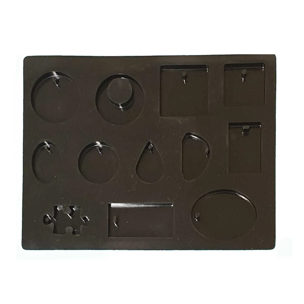1 sheet of 12 assorted geometric pendant shapes with hole. Mould measures 15.2×11.3cm and each shape varies in size from 2.5cm to 4cm in length.