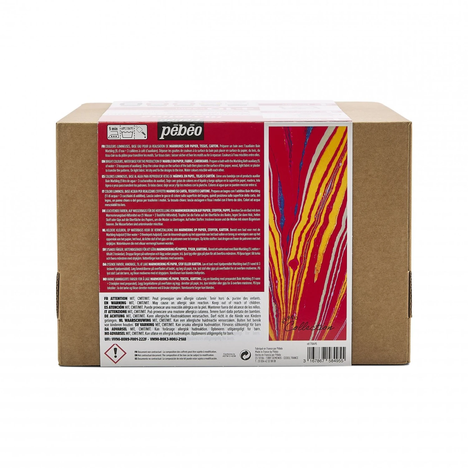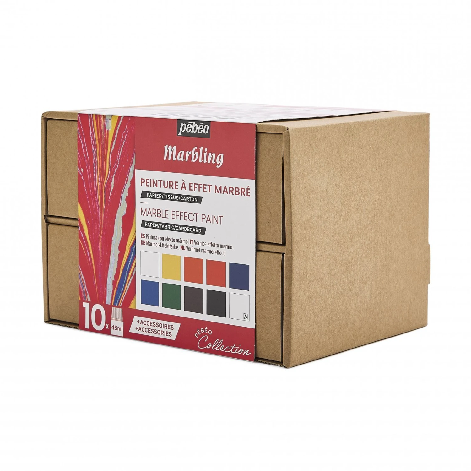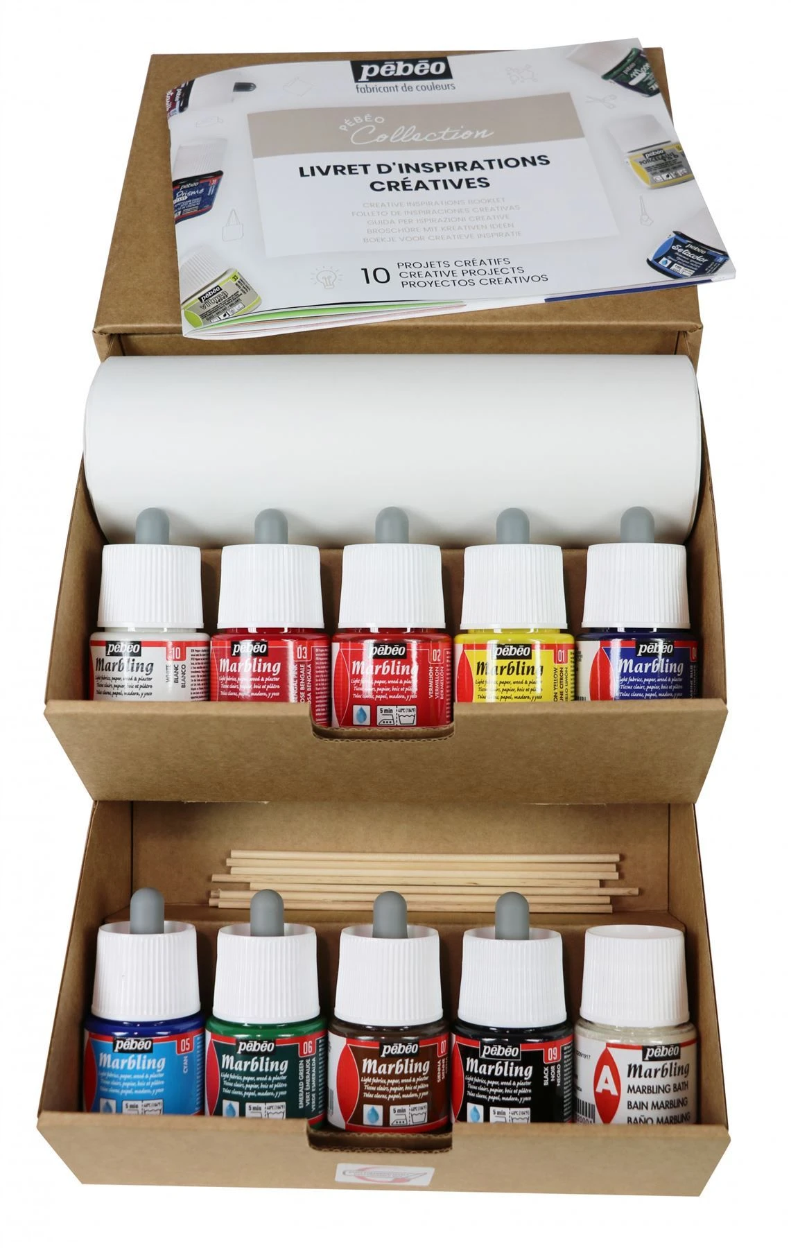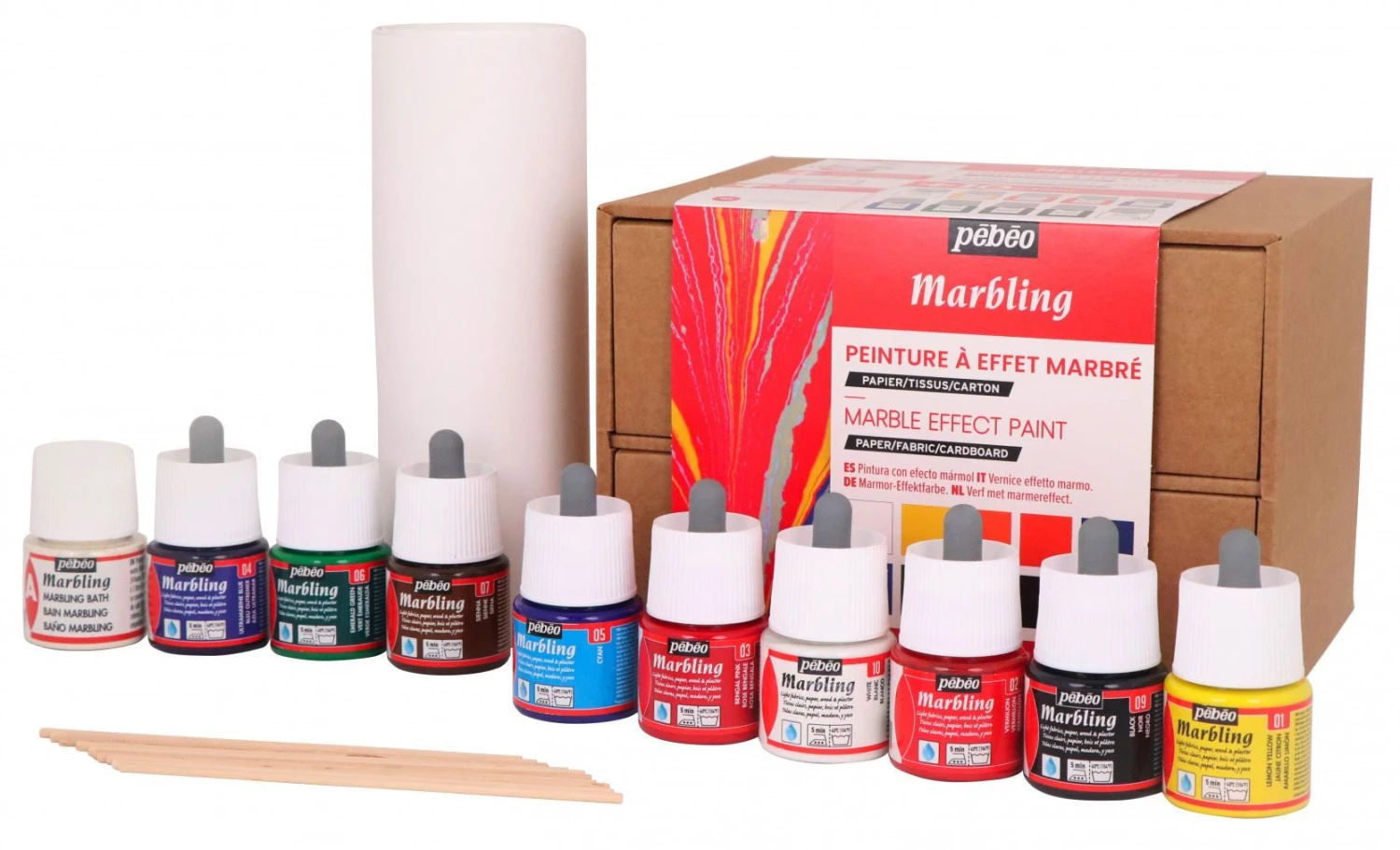 Contents: 10 x 45ml Marbling Ink (White, Lemon Yellow, Vermilion, Bengal Pink, Ultramarine Blue, Cyan, Emerald Green, Sienna and Black), 1 x 35 g marbling bath, 1 leaflet.