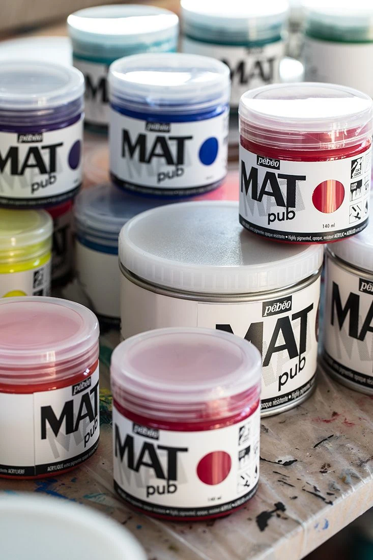 Ready-to-use water-based highly-pigmented matt acrylic paint with no cadmium pigments, Mat Pub is highly covering, in colours that can be mixed together and that have excellent lightfastness.
