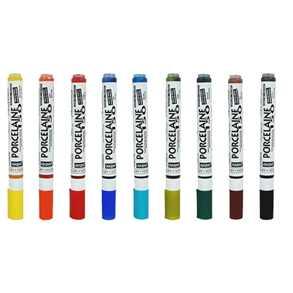 A set of 9 assorted colour water-based marker pens for the permanent decoration of ceramics.