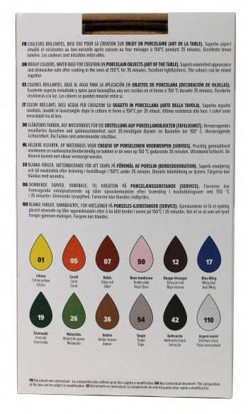 Decorate your porcelain, earthenware and ceramics. Once baked, colours develop a beautiful enamelled appearance. All colours can be mixed together – so the creative possibilities are endless!