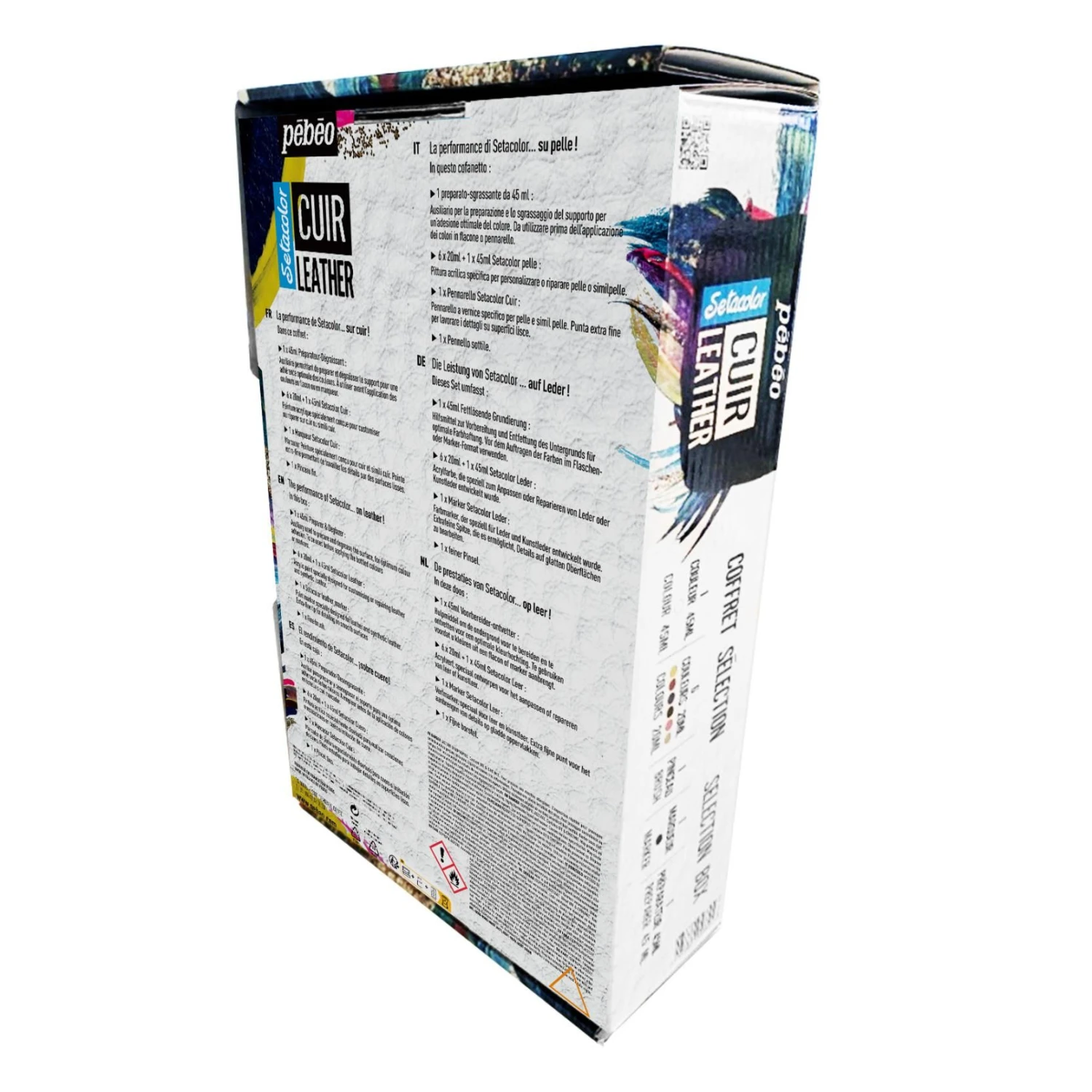 The Setacolor Leather Selection Box contains an exciting assortment of colours, including a fine detail marker paint pen, that can be mixed or used on their own, plus the essential Preparer & Deglazer medium for surface degreasing and preparation before painting.