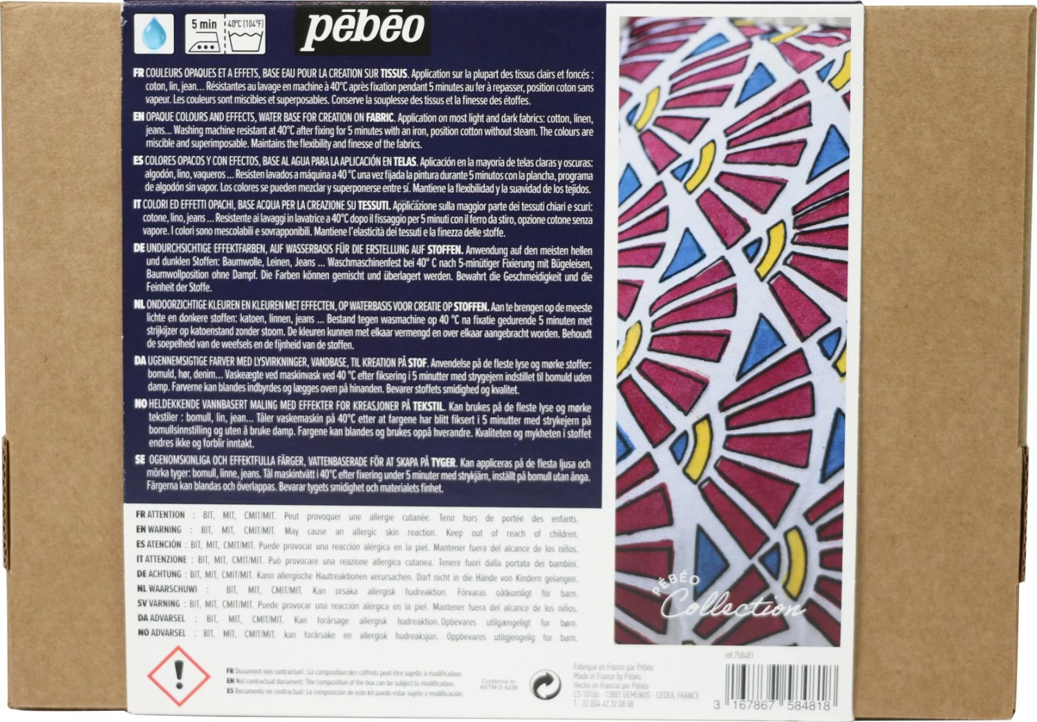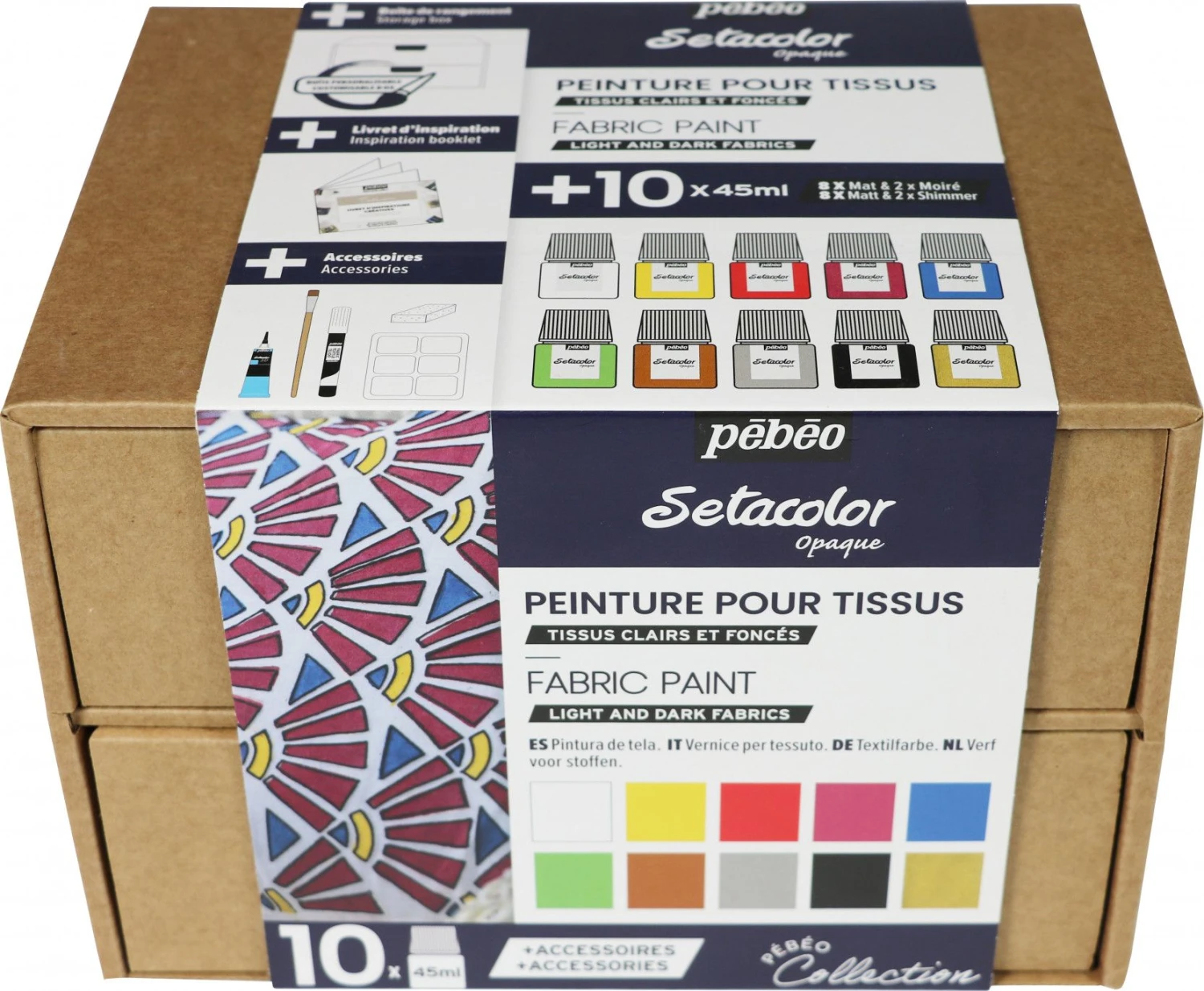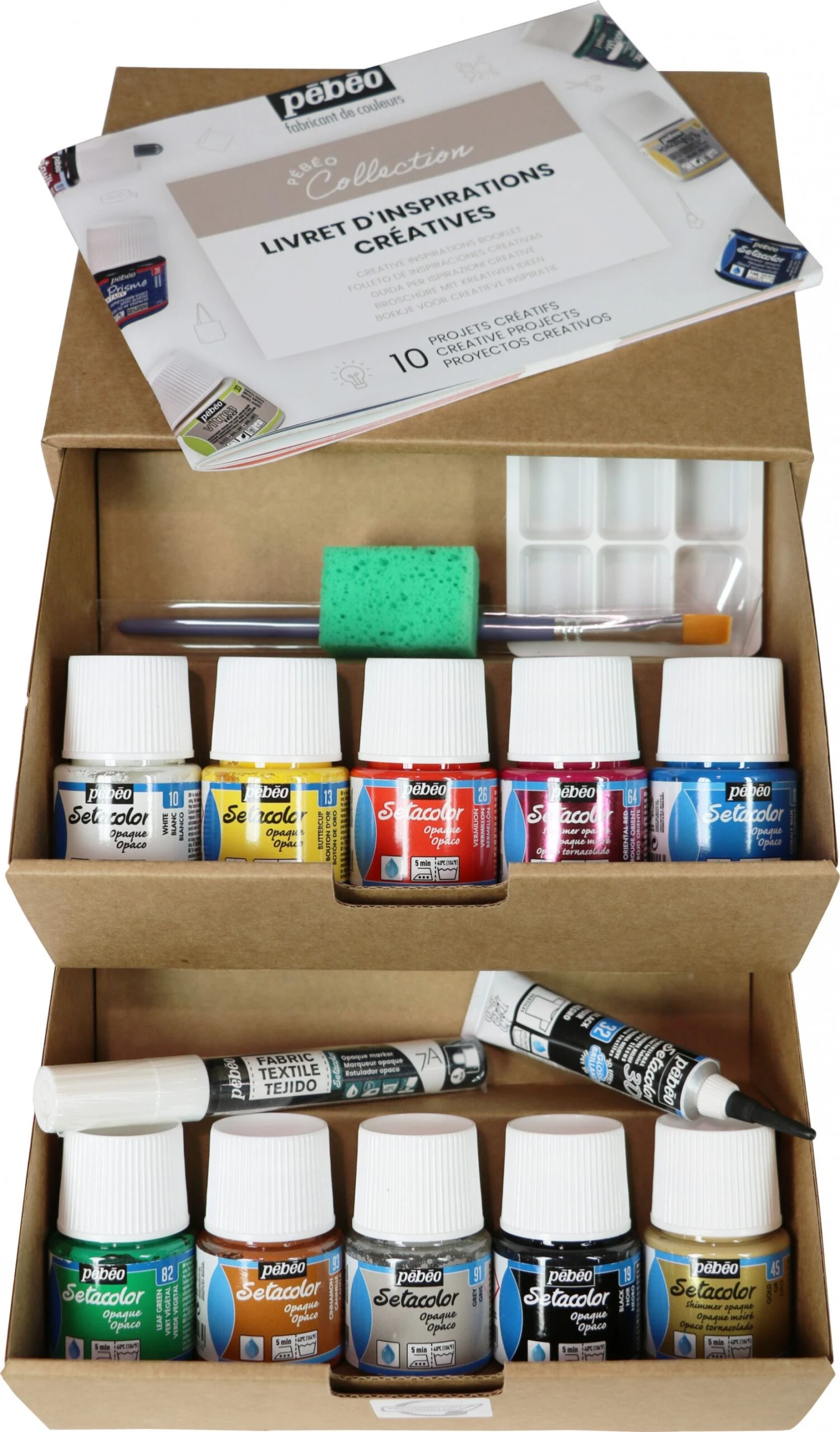 An introductory box set of Pebeo Setacolor fabric paints and accessories.