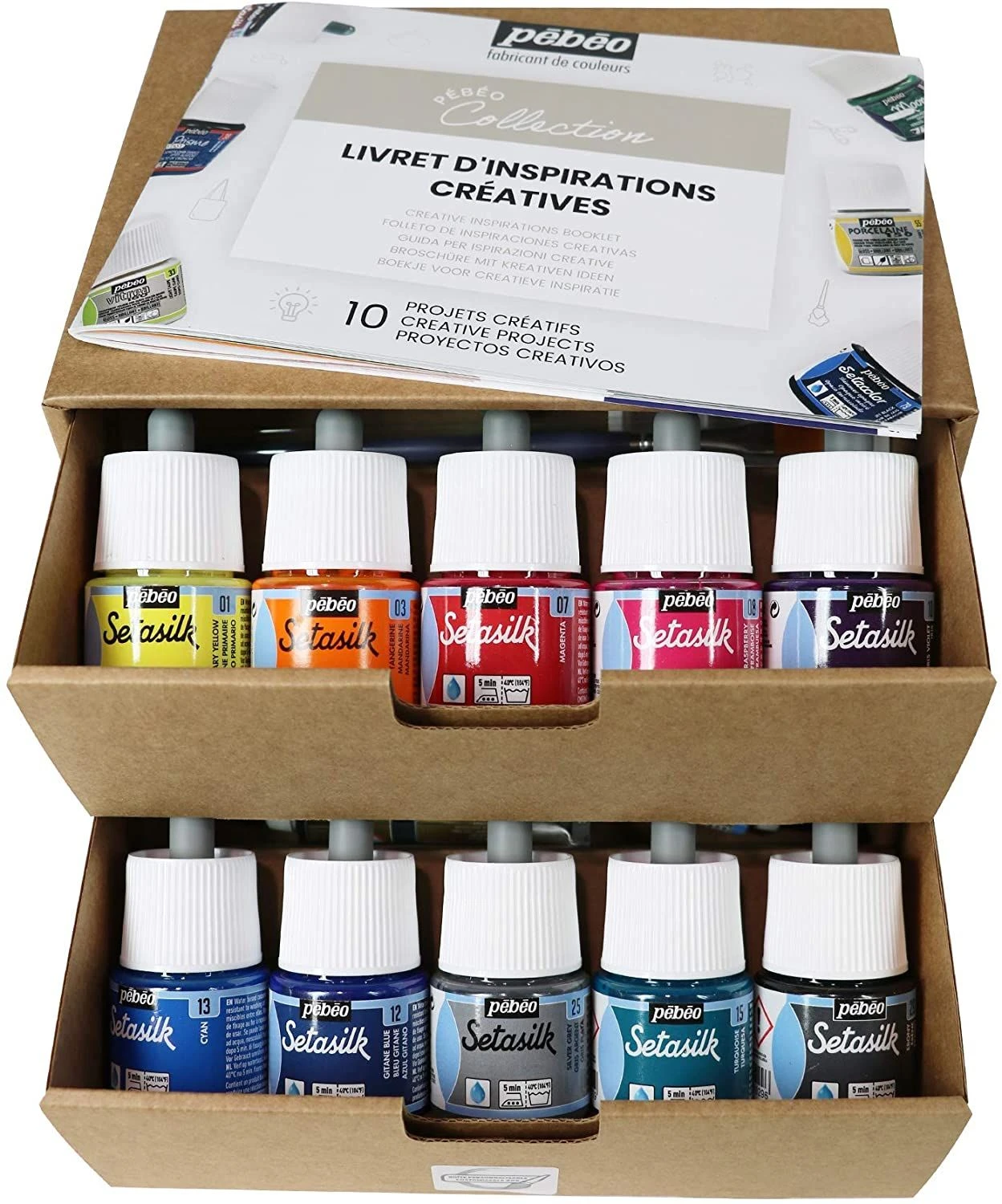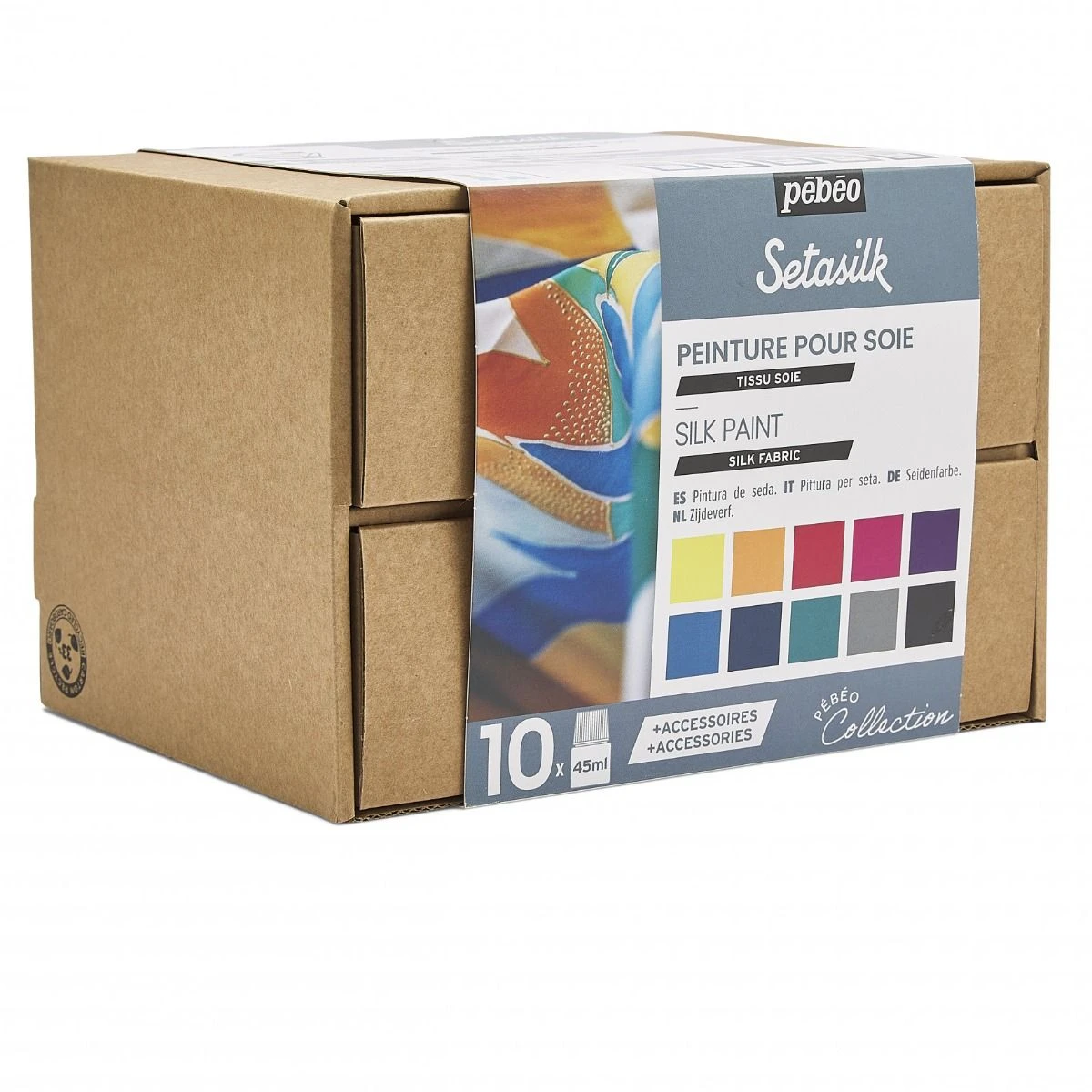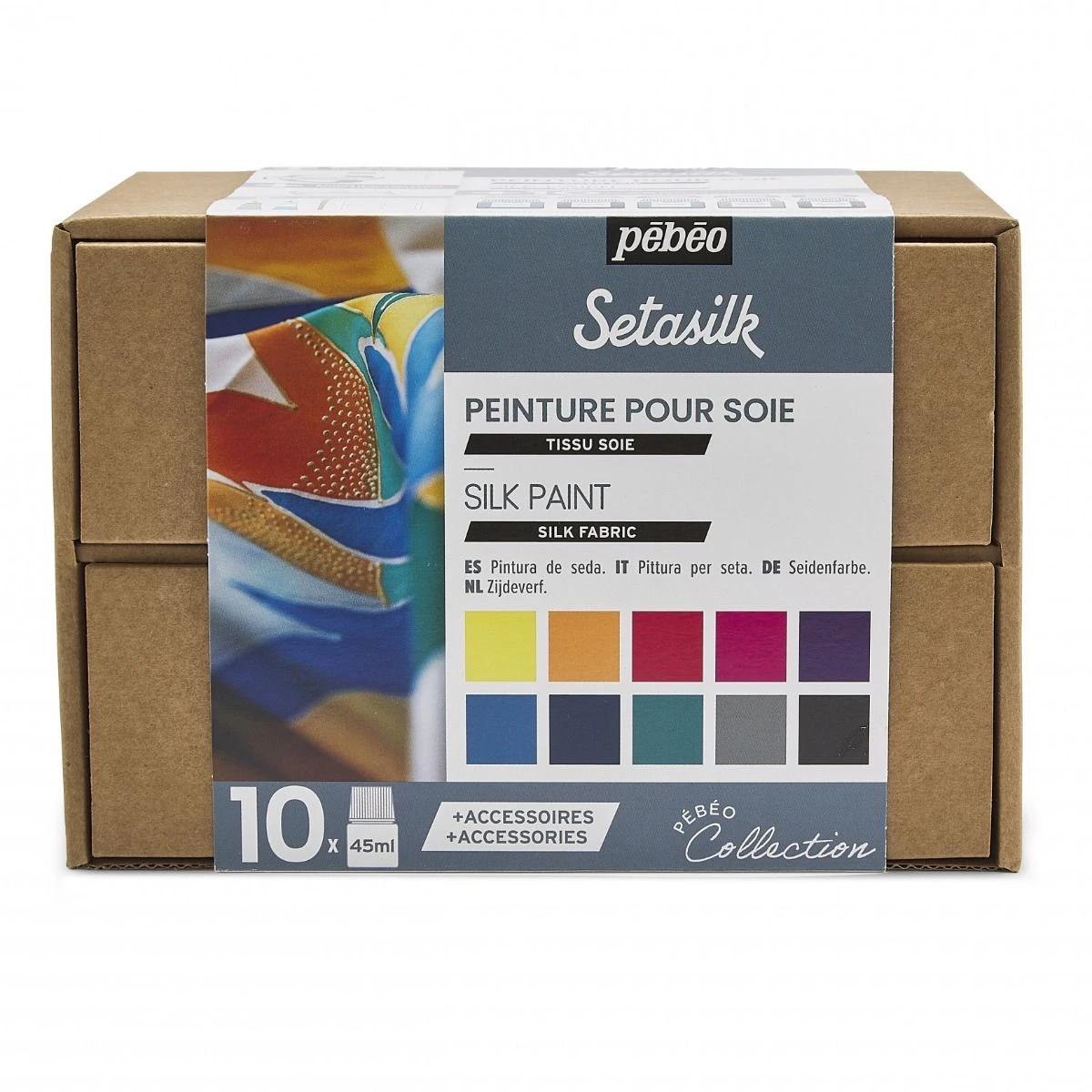 An introductory box set of 10 assorted Pebeo Setasilk colours plus accessories.