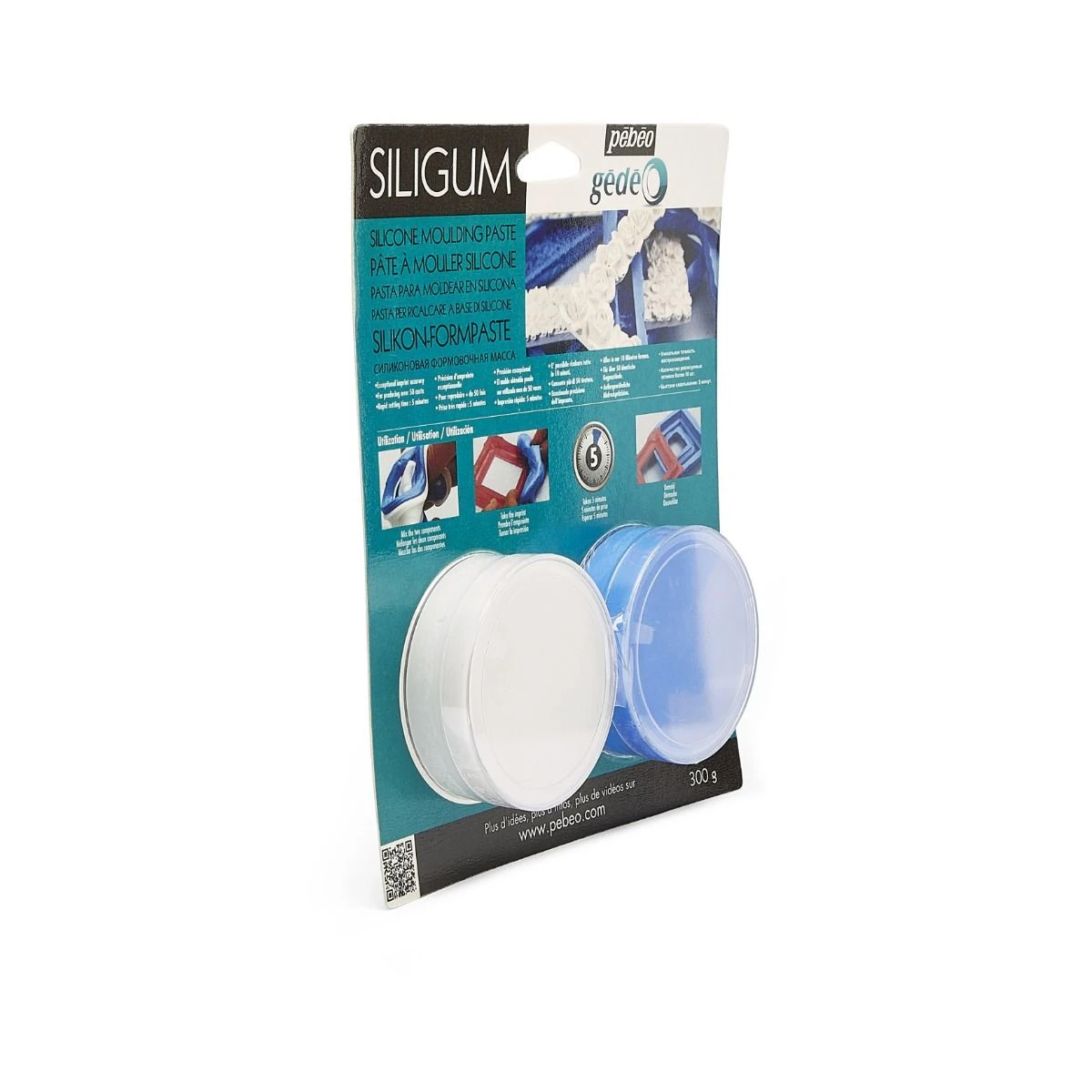 Pebeo Gedeo Siligum set contains two components for making your own unique casts – mix the blue and the white pastes together and roll until fully merged. Make an impression using any item or shape of your choice to create a cast – sets in five minutes.