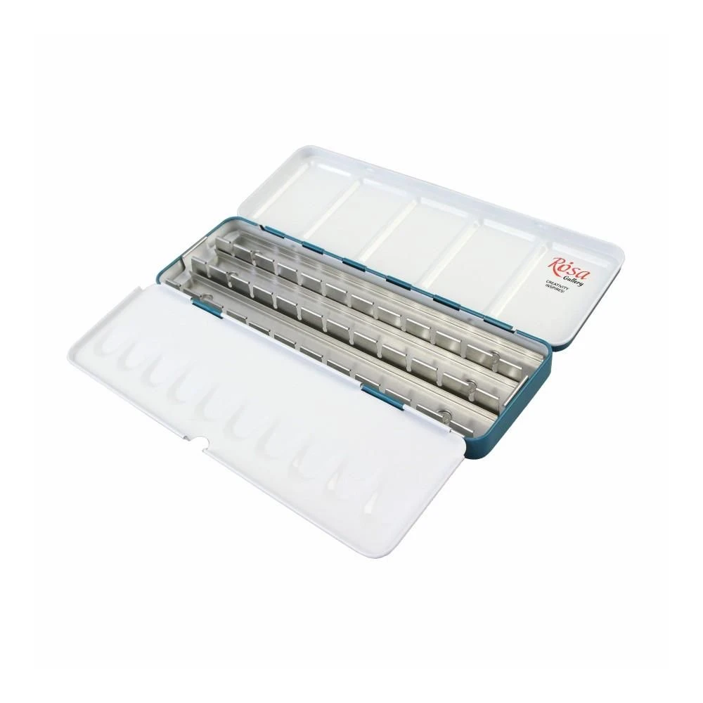 The ROSA Gallery Watercolour Cases are metal boxes with two palettes of different configurations. They have a special insert for the pans and a convenient finger holder on the bottom of the case, which makes it easy to hold the paint in a hand while working.