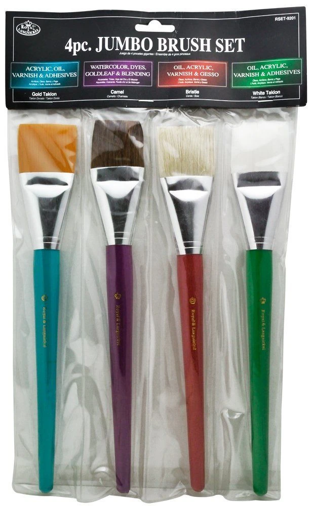 Includes a Gold Taklon (Acrylic, Oil, Varnish & Adhesive), Brown Taklon (Acrylic, Oil, Varnish & Adhesives), Bristle (Oil, Acrylic, Varnish & Gesso) and a White Taklon (Oil, Acrylic, Varnish & Adhesive).