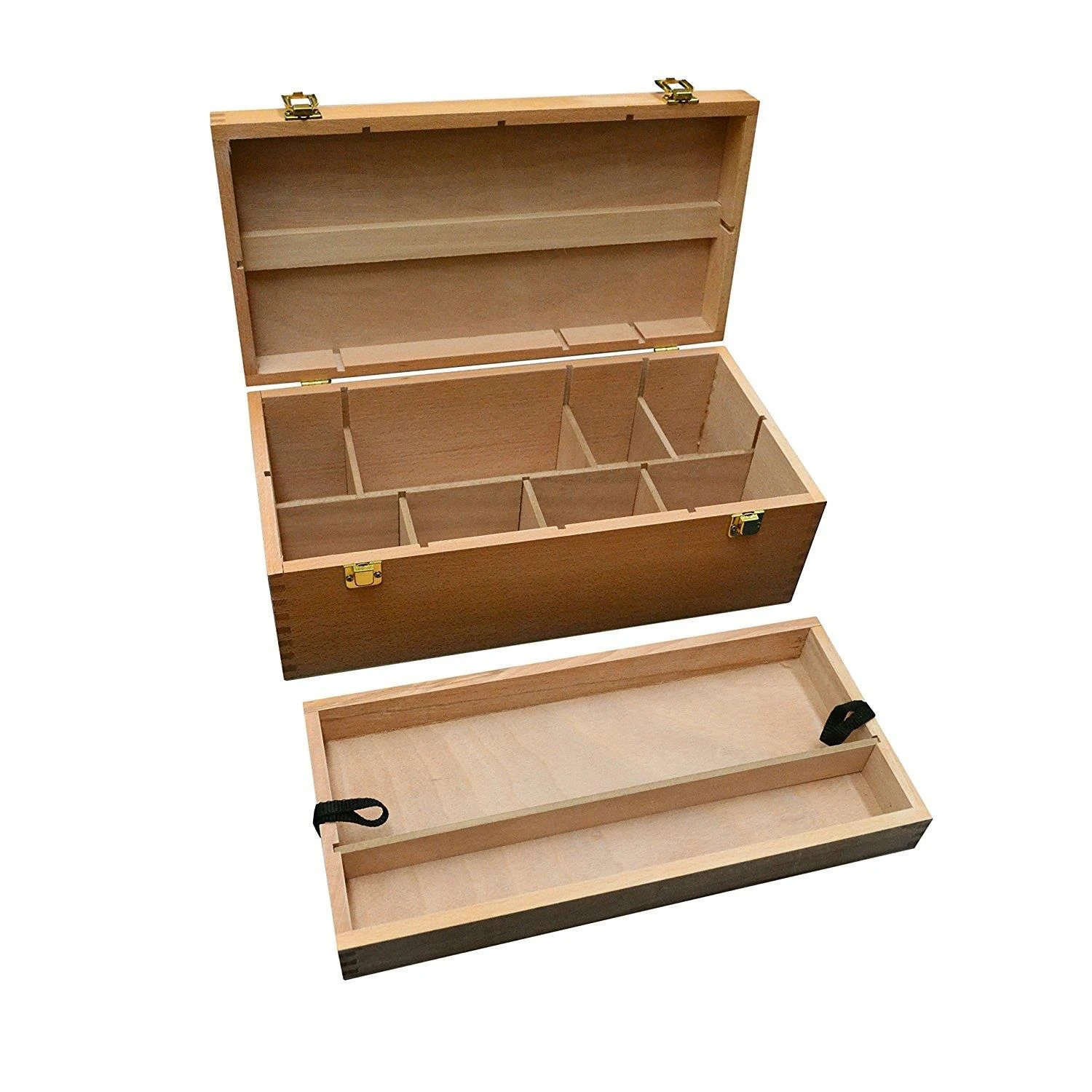 The SHERWOOD Wooden Storage Box features a pull out tray with 2 long compartments and 8 x assorted sized internal compartments for organising and protecting your materials. The wooden dividers can be removed if more space is required. The box can be transported with the imitation leather handle.Â