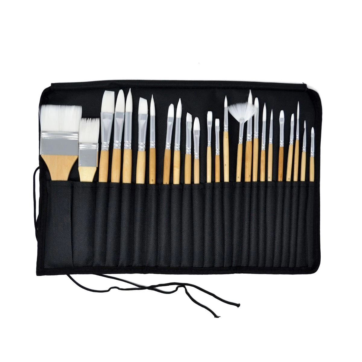 The set includes 2 x Flat Wash Brushes, 4 x Flat Brushes, 6 Filbert Brushes, 3 Angle Brushes, 7 Round Brushes, 1 Liner Brush and 1 Fan Brush.Â