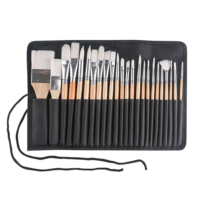 A set of 24 white nylon wooden handled paint brushes in assorted shapes and sizes.