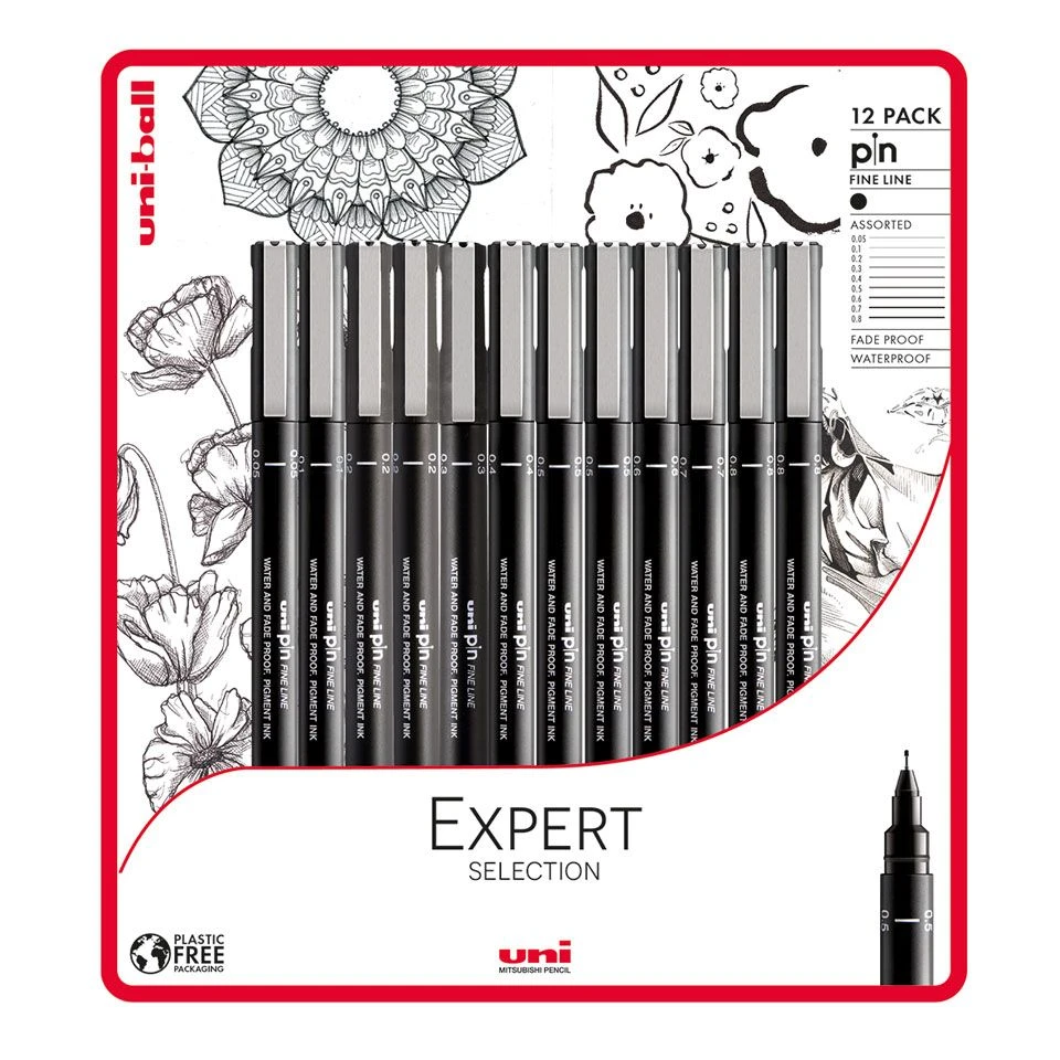 This pack gives you the choice of 12 hard working PIN pens in eight essential black PIN nib sizes from delicate 0.05mm to a robust 0.8mm tip.