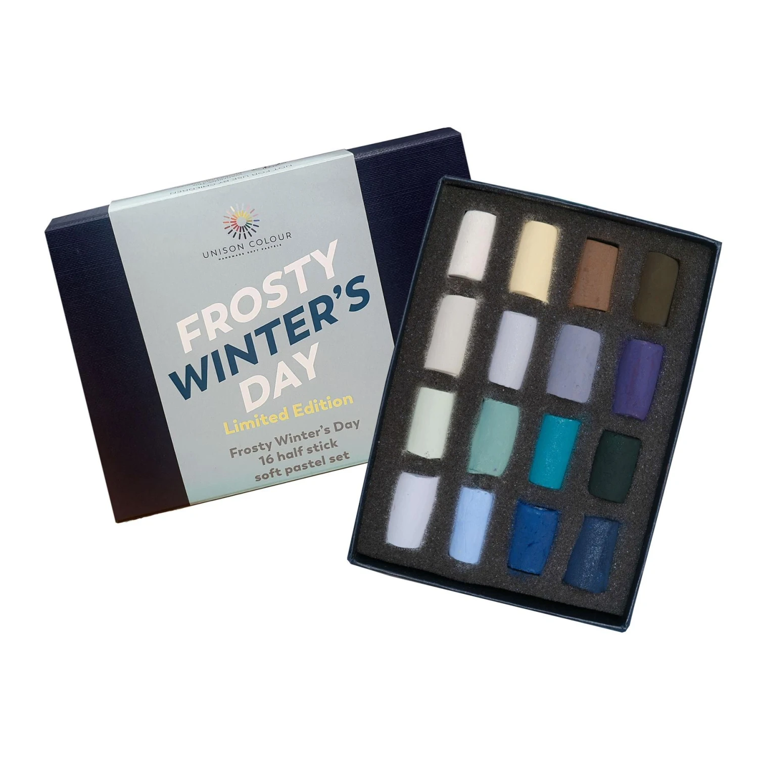 A Limited Edition curated set of 16 half sticks inspired to capture a chilly winter’s day. Includes 4 sparkly colours for that extra frosty shimmer.