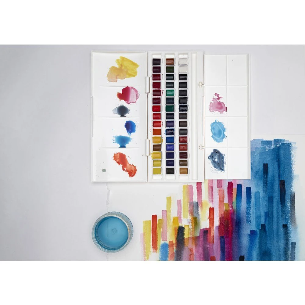 The Cotman Half Pan Studio Set contains all 40 colours (plus doubles on the most popular colours) in half pan sized blocks. The box includes an integral fold out palette for colour mixing and a space for your brush when travelling or painting outdoors.Â