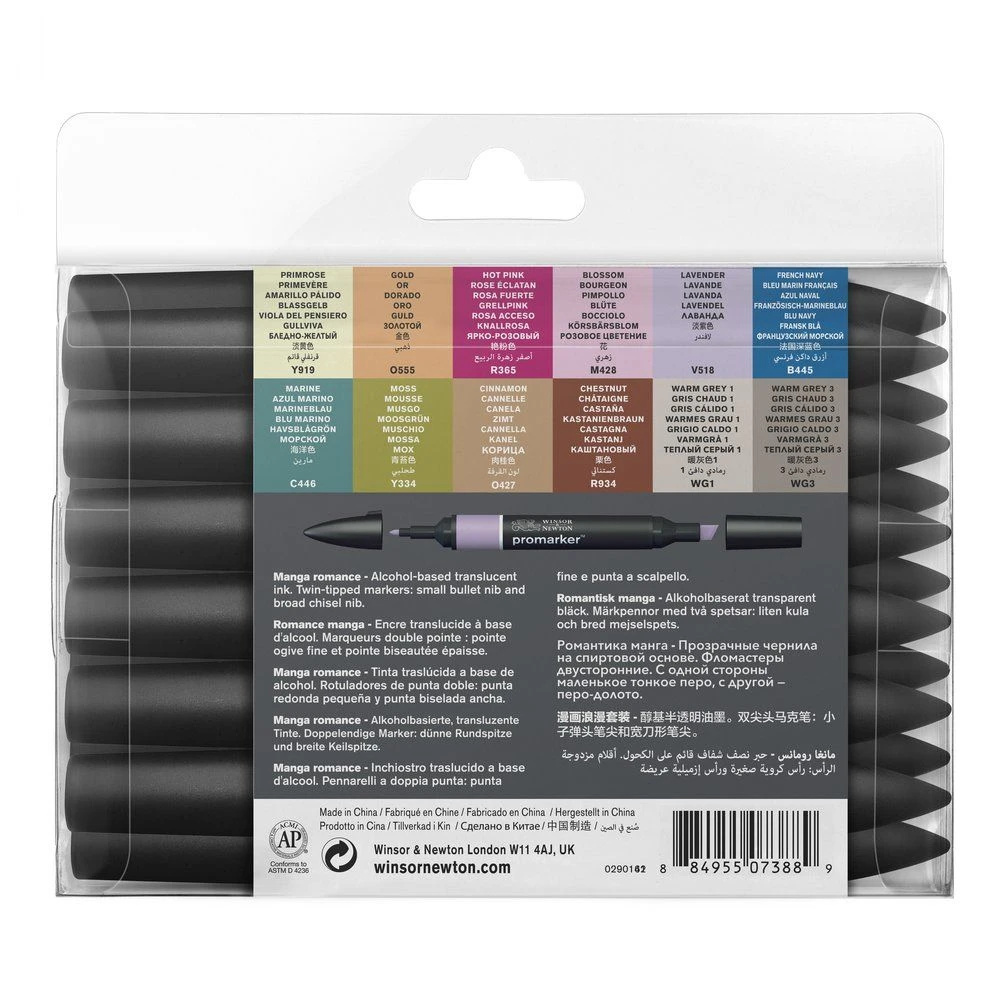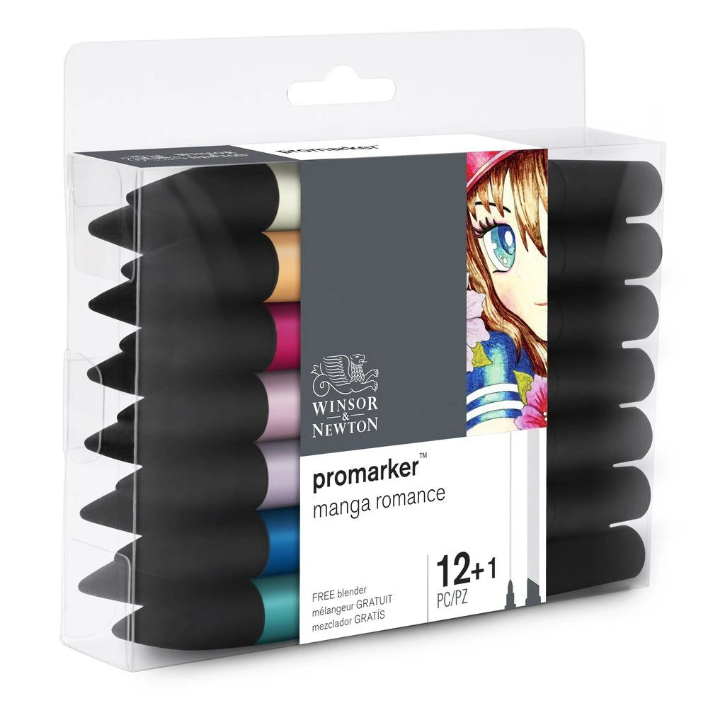 The Manga Romance Set contains 13 markers: Primrose, Gold, Hot Pink, Blossom, Lavender, French Navy, Marine, Moss, Cinnamon, Chestnut, Warm Grey, Warm Grey 2 and the colourless Blender.