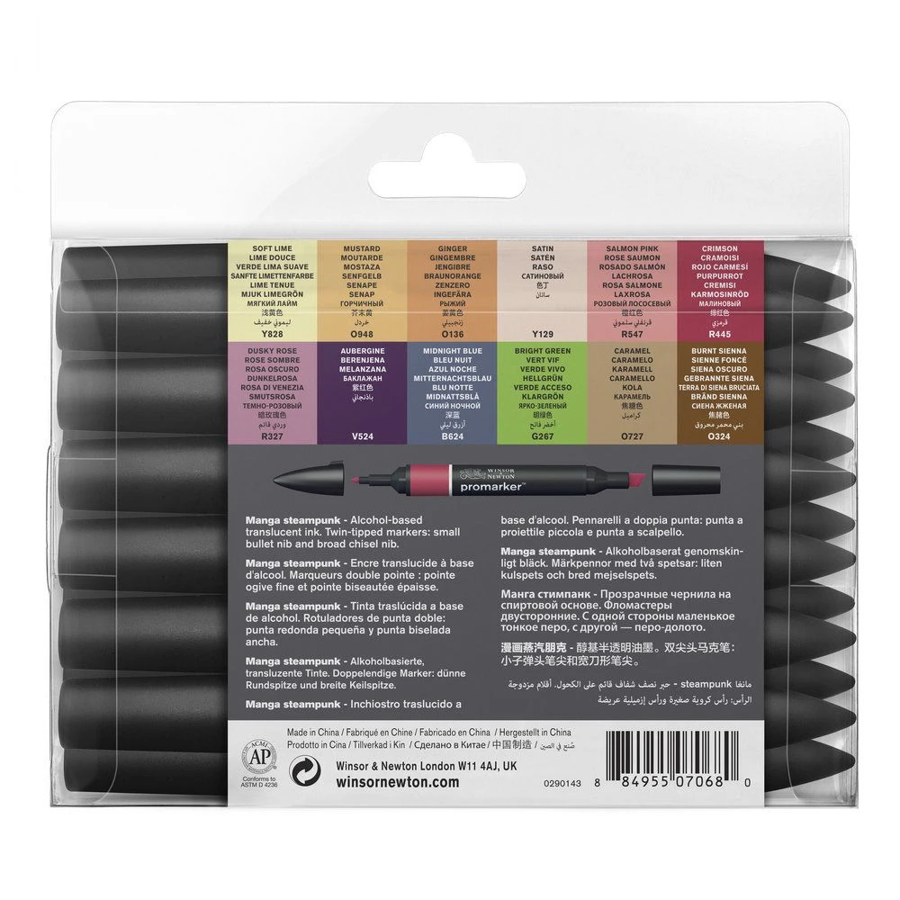 The Manga Steampunk Set contains 13 markers:Â Soft Lime, Mustard, Ginger, Satin, Salmon Pink, Crimson, Dusky Rose, Aubergine, Midnight Blue, Bright Green, Caramel, Burnt Sienna and the colourless Blender .