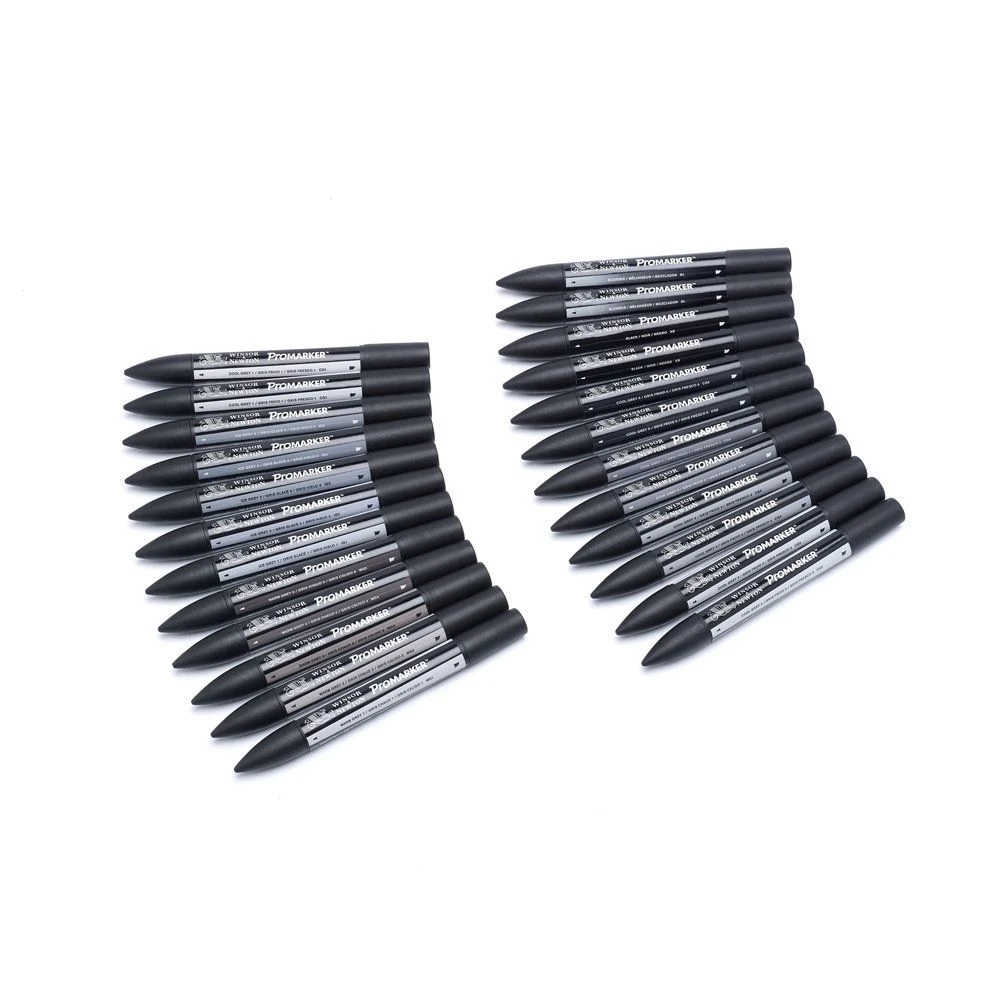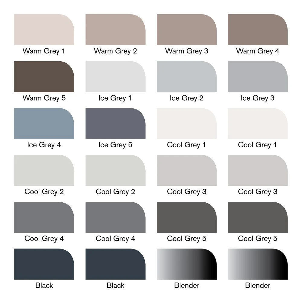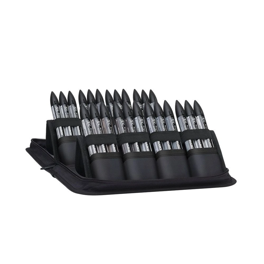 Marker Case contains: 24 x Promarkers in colours Warm Grey 1, Warm Grey 2, Warm Grey 3, Warm Grey 4, Warm Grey 5, Ice Grey 1, Ice Grey 2, Ice Grey 3, Ice Grey 4, Ice Grey 5, Cool Grey 1 (x2), Cool Grey 2 (x2), Cool Grey 3 (x2), Cool Grey 4 (x2), Cool Grey 5 (x2), Black (x2) and the Blender pen (x2).