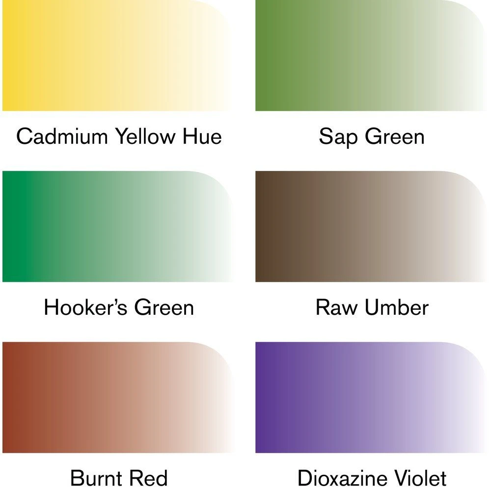 Colours included: Cadmium Yellow Hue, Sap Green, Hooker’s Green, Raw Umber, Burnt Red and Dioxazine Violet.